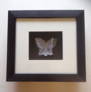 This delicate lace butterfly is set back from the glass to allow the wings to maintain the 3D look! We can create the same box to almost any depth to allow space for larger creative pieces!!